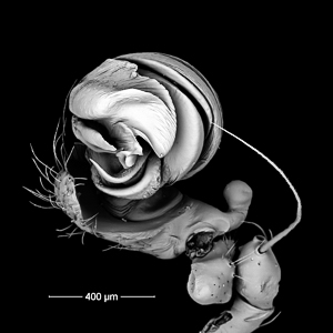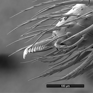 | Epigyne of Araniella cucurbitina. | Spinnerets of Araniella opisthographa | Tarsal claw of Araniella opisthographa. Note the central claw and barbed bristles typical of web-dwelling spiders. | ||